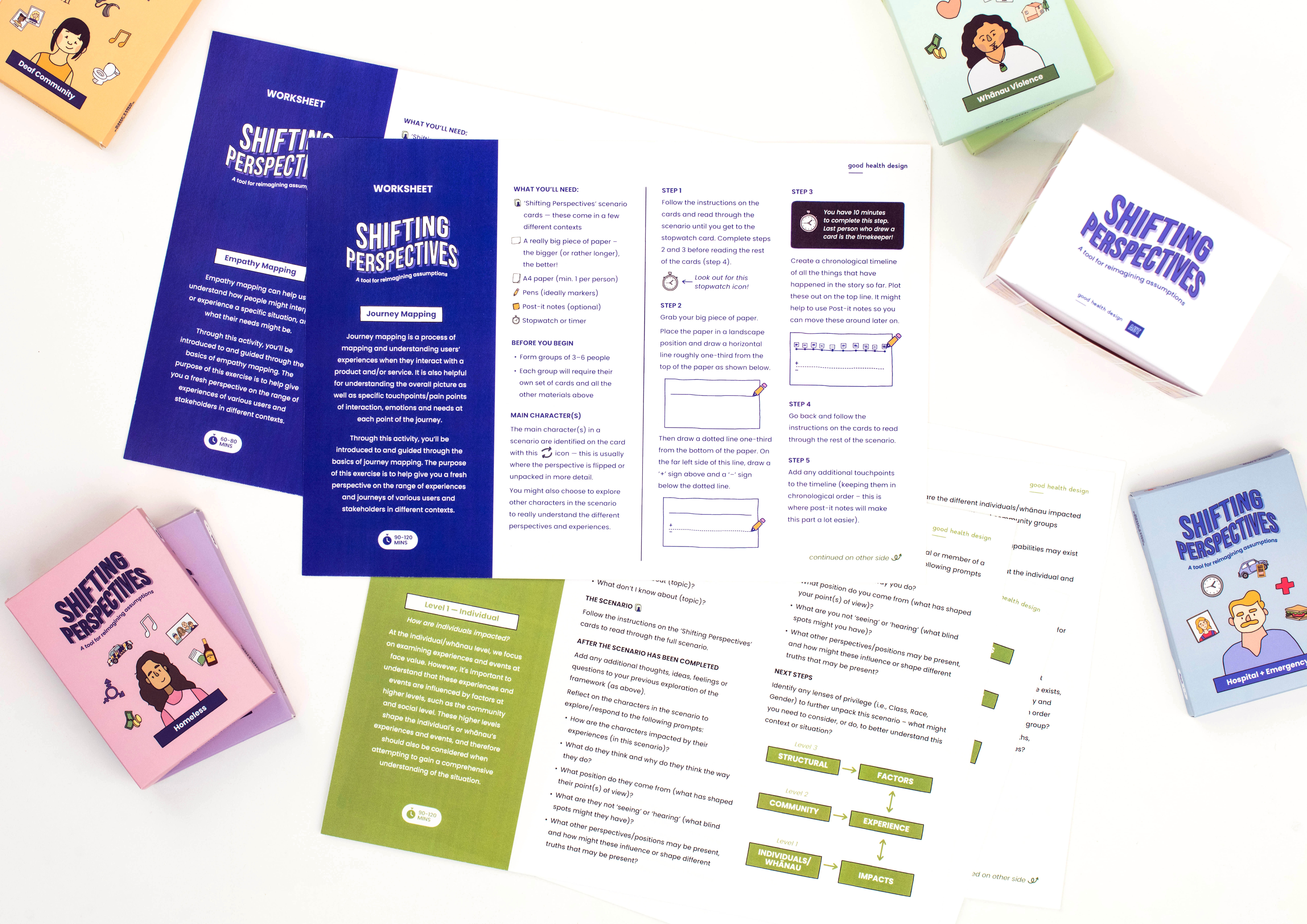 Shifting Perspectives is a storytelling-based toolkit designed by Good Health Design to help people surface assumptions, explore lived realities, and reimagine new possibilities. Centred around real-world scenarios drawn from contemporary research, the toolkit supports critical thinking and empathy through facilitated workshops that explore the complexities of individual, whānau, and systemic experiences across the health and wellbeing landscape.
